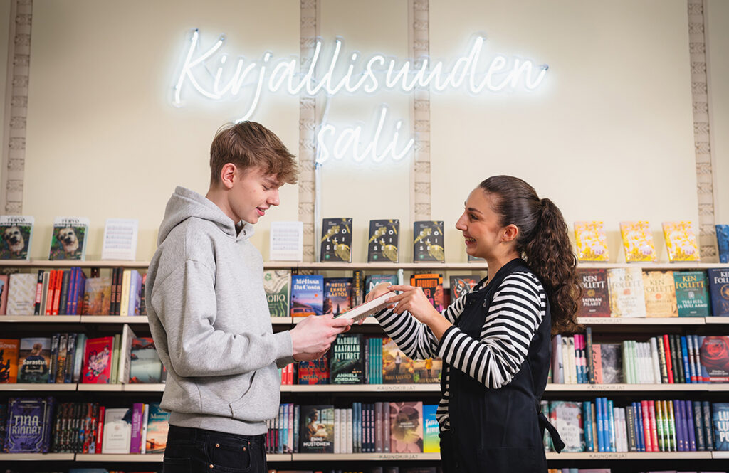 Kirjakaupasta tuli hyvin nopeasti elämäni kivijalka. Kun aloitin 16-vuotiaana, suurin osa työkavereistani oli huomattavasti vanhempia kuin minä. He ottivat minut hoiviinsa, ja ajan myötä heistä tuli kuin toinen perheeni. Vaikka työkaverit ovat moneen kertaan vaihtuneet, sama hyvä ilmapiiri ja yhteisöllisyys on jatkunut. Nyt minä olen se vanhin, ja haluan tukea nuorempia kollegoitani.
